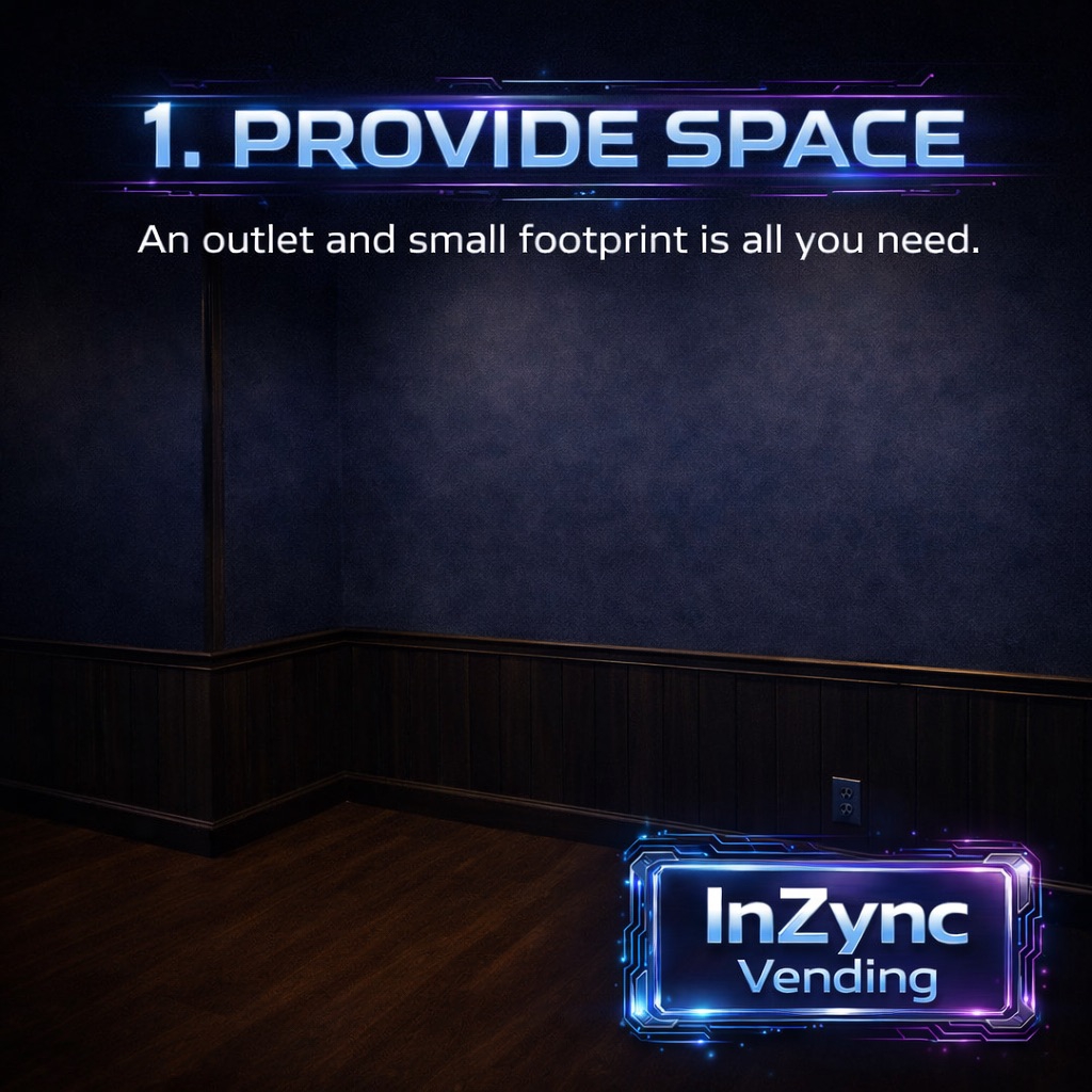 You provide the wall or floor space and an electrical outlet. We provide the machine, inventory and replenishment!
